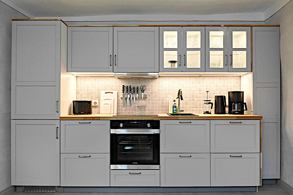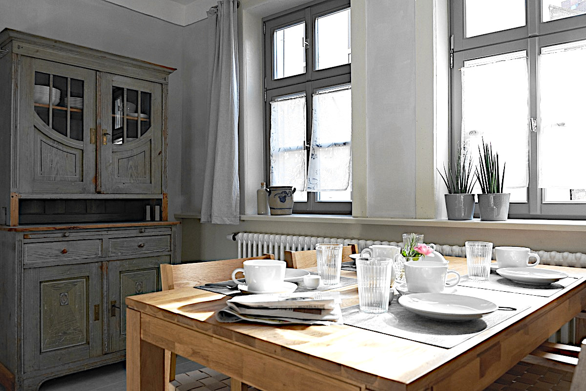 Die Küche im Erdgeschoss ist mit einer Küchenzeile, einem Geschirrschrank und einem Essplatz komplett eingerichtet. Backofen, Kühlschrank Spülmaschine etc. sind ebenso selbstverständlich wie Kaffeemaschine, Koch- und Tafelgeschirr. Der Esstisch ist Treffpunkt und Beobachtungspunkt für das Leben auf der vor dem Haus vorbei führenden Mittelgasse gleichermaßen.