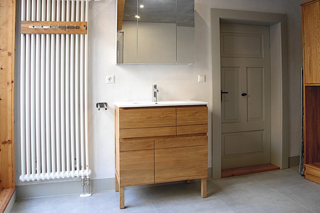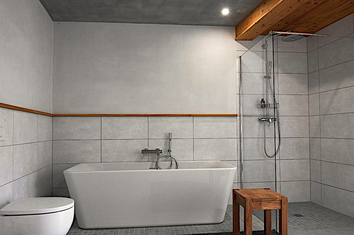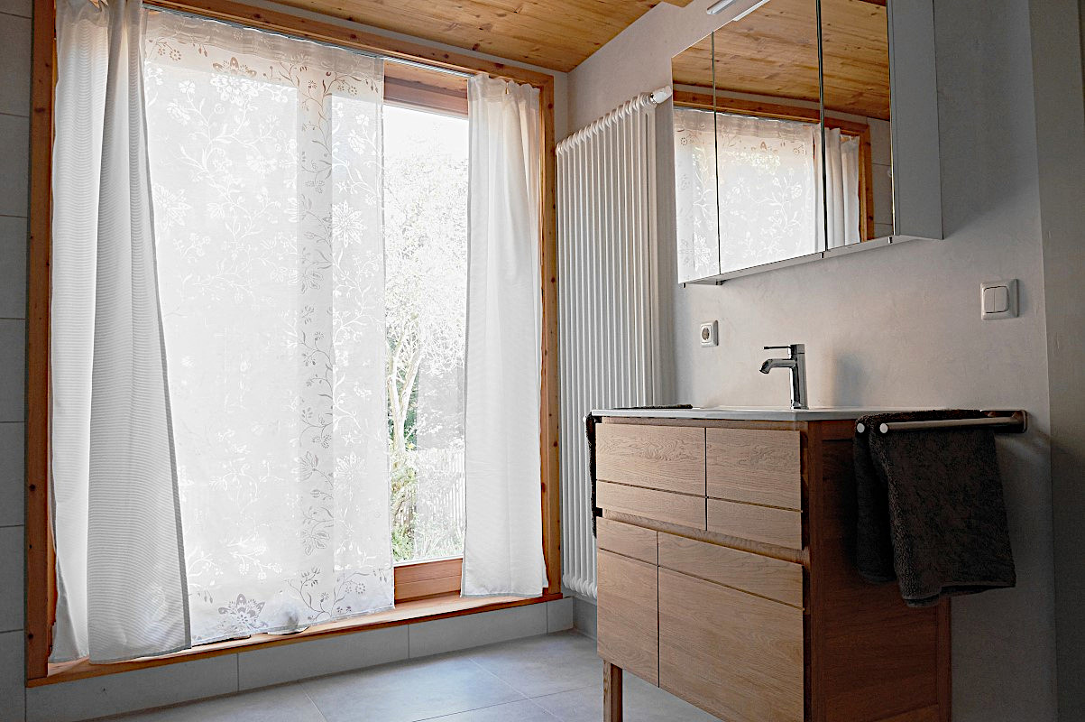Das geräumige Bad liegt ebenfalls im Erdgeschoss. Es wurde nicht nur mit einer großzügigen Walk In Dusche, sondern auch mit einer großen Badewanne ausgestattet. Das hohe und breite Fenster neben dem Waschtisch geht zum Garten hin und lässt angenehm viel Licht herein.