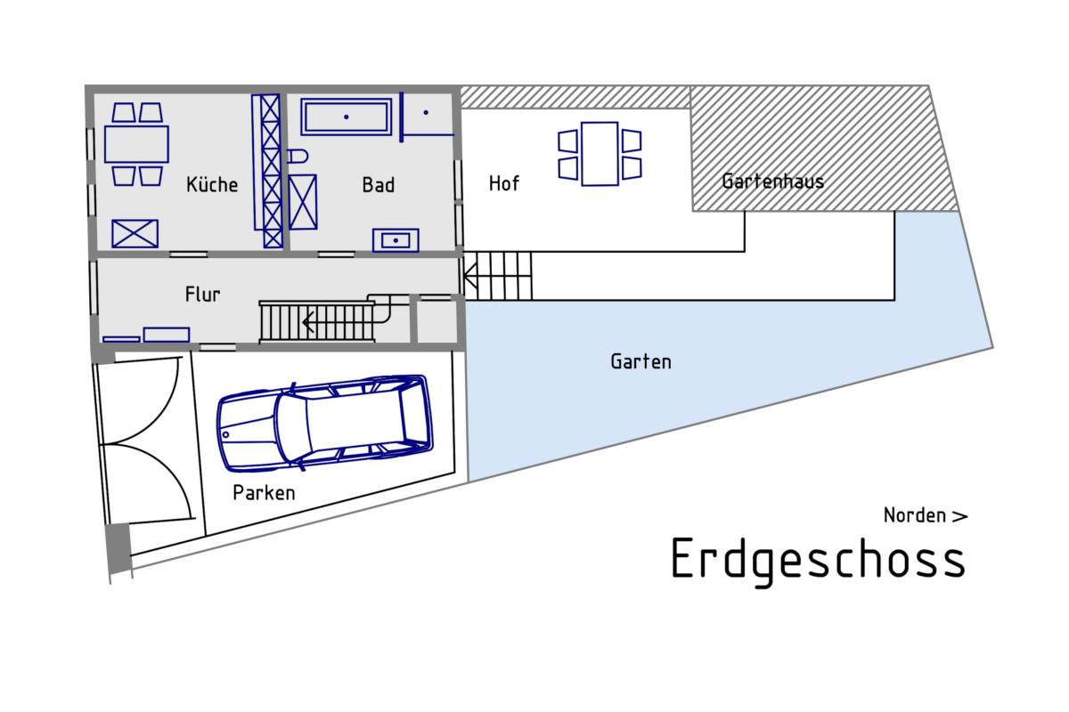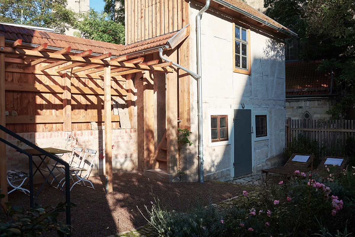 Im rückwärtigen Bereich des kleinen Grundstückes ist noch ein Teil der ehemaligen Hintergebäude erhalten geblieben. Das kleine zweistöckige Gartenhaus wird vorerst für Abstellzwecke genutzt.