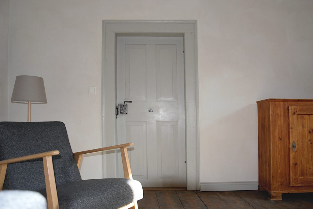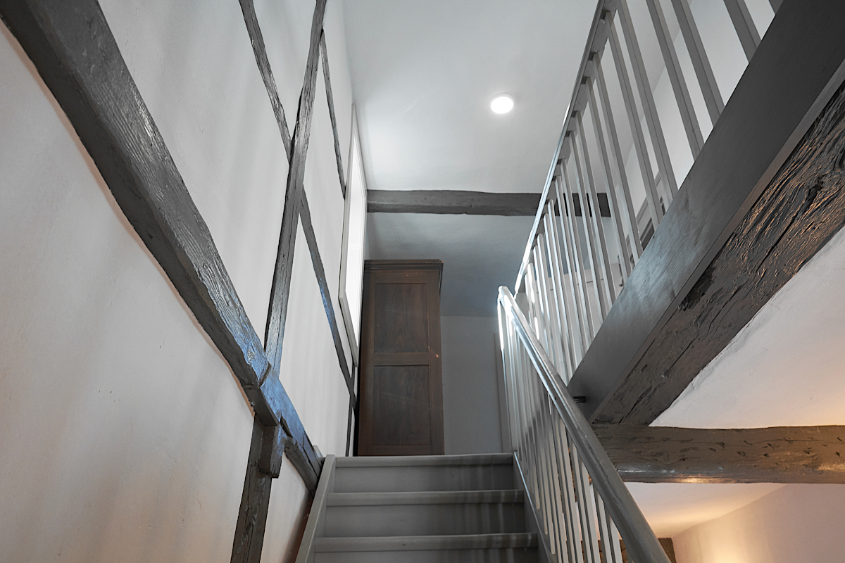 Die Treppen, Geländer und Fußböden der schmalen Flure im ersten und zweiten Obergeschoss wurden aufgearbeitet, ebenso wie vier historische Türen zu den angrenzenden Zimmern. Diese alten Türen und auch das sichtige Fachwerk der Außenwände tragen maßgeblich zu dem gefälligen Erscheinungsbild der Treppenräume und Flure bei.