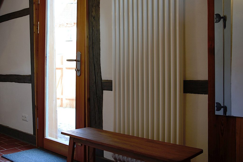 Ein langer schmaler Flur ist der Eintritt in das Ferienhaus „Zur grauen Maus“ und verbindet in gerader Linie die repräsentative zweiflügelige Eingangstür mit der Hintertür. Diese moderne, aber schlichte Glastür ist der Ausgang zu Hof und Garten. Die Glastür an der Längsseite des Flures führt dagegen direkt zum Parkplatz. Eine kleine Garderobe ist die einzige Einrichtung dieses schlichten Raumes.