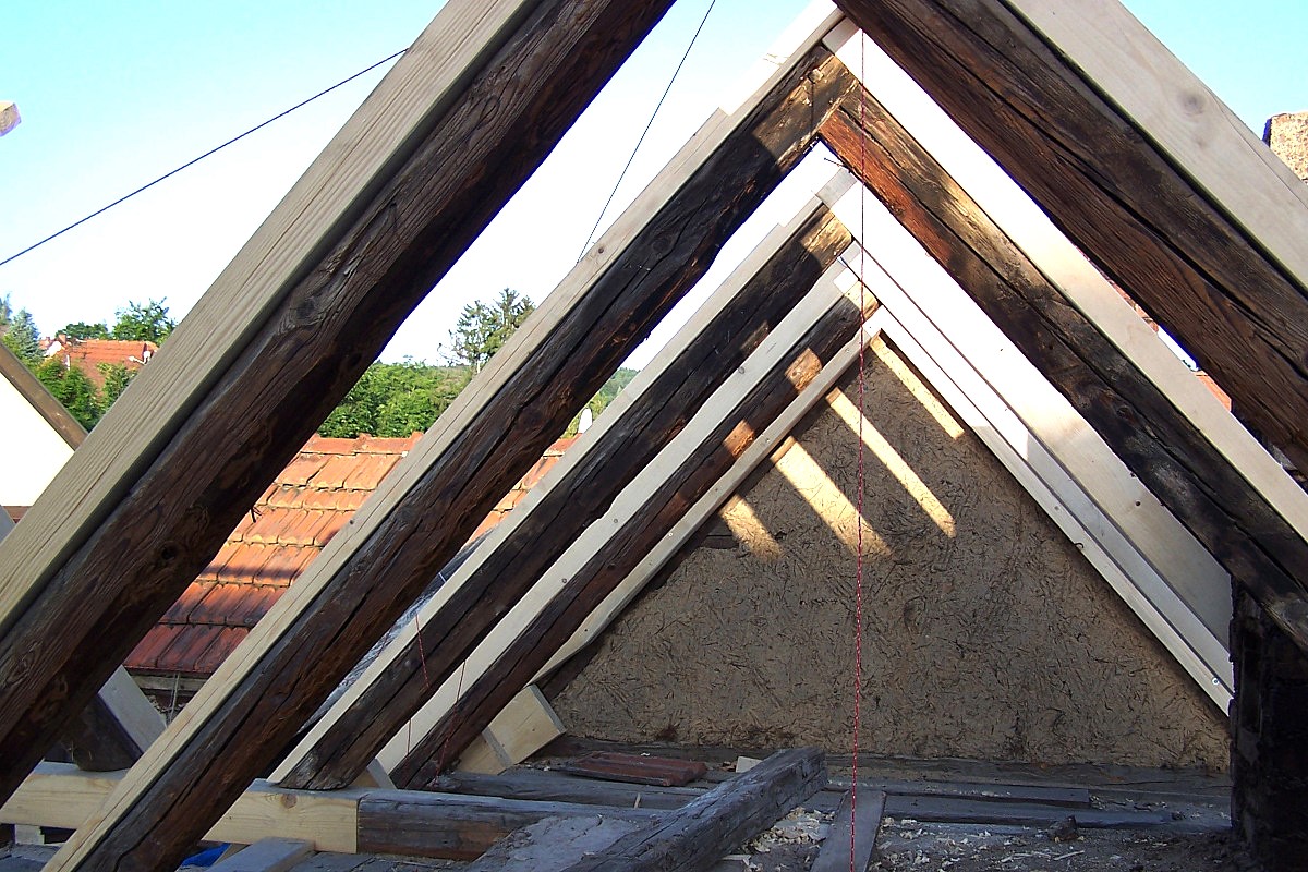 Die Zimmererarbeiten erfolgten handwerklich mit Zapfen- und Blatt- Verbindungen. Winkel und Nagelbleche kamen nicht zur Anwendung. Geschädigte Balken wurden bis ins gesunde Holz zurück geschnitten und neue Hölzer im vorhandenen Querschnitt angesetzt. Der Holzschutz erfolgte konstruktiv, Holzschutzmittel kamen nicht zum Einsatz. Der vorhandene Dachstuhl wurde ertüchtigt, dazu alte Sparren bei Bedarf bis zur notwendigen Tragfähigkeit verstärkt und Fehlstellen ergänzt. Nach aufbringen einer Holzschalung und einer regensicheren Unter- Deckung wurde das Dach mit Muldenfalzziegeln in naturrot eingedeckt.