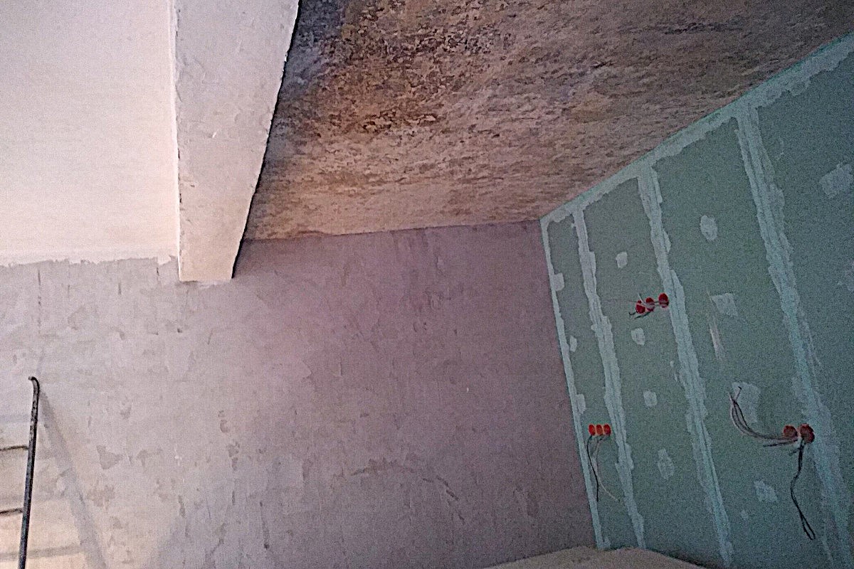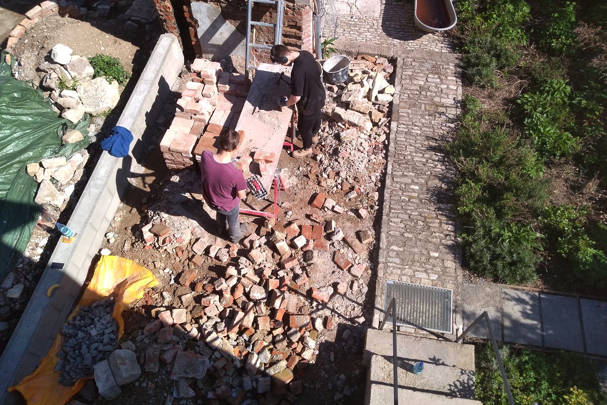 Aufgrund der erheblichen Gebäudeschäden waren vor Beginn der eigentlichen Maßnahmen umfangreiche Abstützungen an Nord- und Ostfassade erforderlich. Zudem mussten hier das Fundament erneuert und auch der Gebäudesockel in Kalkbruchstein- Mauerwerk neu aufgemauert werden.
