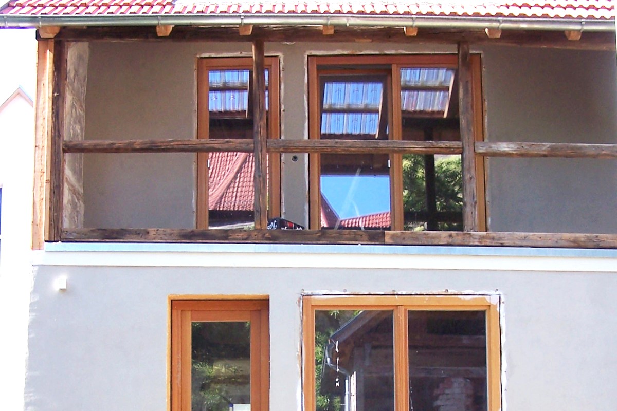 Für die Ausmauerung offener Gefache kamen Leichtlehmsteine und Lehmmörtel zur Anwendung, für die Dämmung der Fassade Holzfaserplatten in einer Dicke von 4,0 bis 10,0 cm. Der anschließend aufgebrachte mineralische Fassadenputz wurde mit einer Silikatfarbe und Streichbürste zweimal von Hand gestrichen.