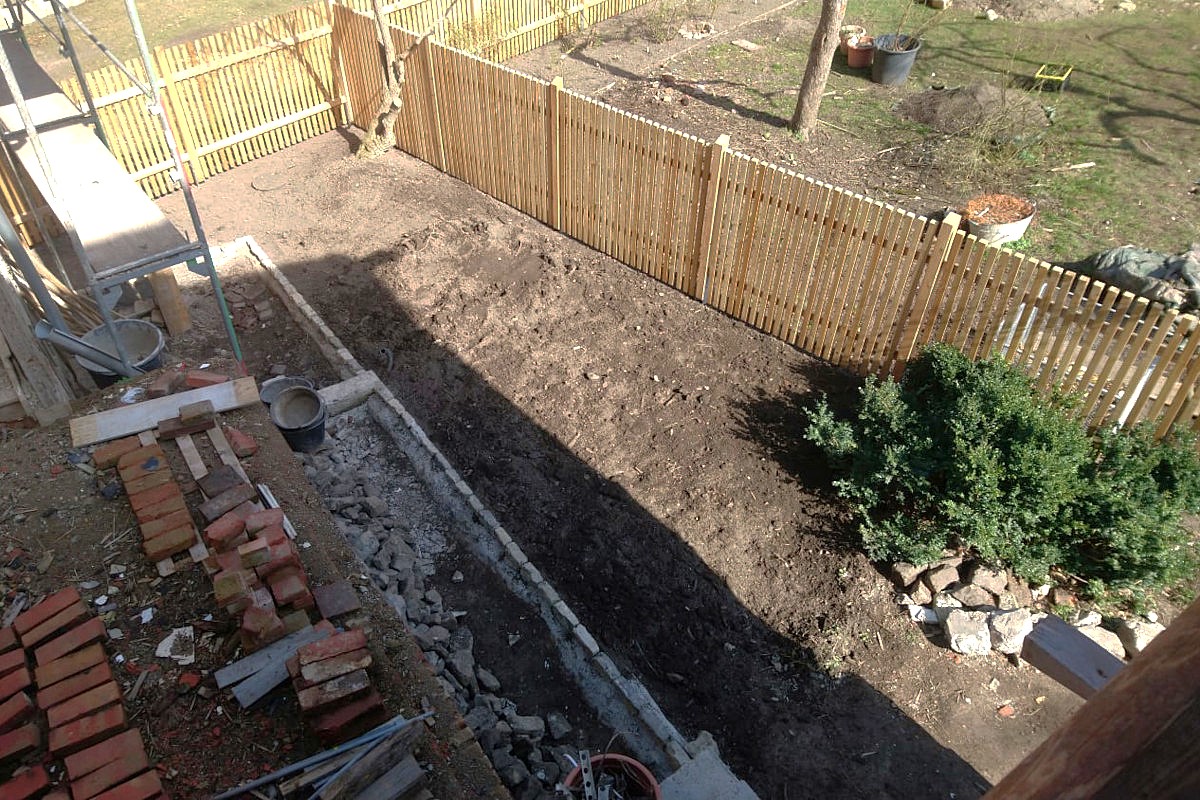 Auf einer Seite des Weges liegt unter einer Pergola der Sitzplatz, der ebenso wie der Parkplatz – abgesehen von der mit Kalkstein gepflasterten Einfahrt – mit einer wassergebundenen Decke befestigt ist. Auf der anderen befindet sich das kleine Gärtchen, bepflanzt mit einer Mischung aus verschiedenen Gehölzen und Stauden. Neben Rosen und Buchsbaum, Eibe und Mispel, Akelei und Lavendel finden sich auch Kräuter und Würzpflanzen, zum Beispiel Oregano, Rosmarin oder Salbei.