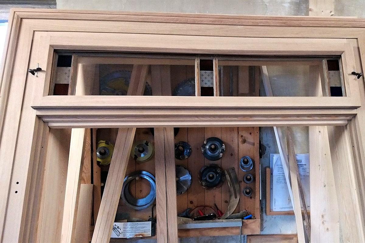 Wie bei den anderen Gewerken wurde auch bei den Tischlerarbeiten – wo möglich – Wert auf Erhaltung statt Erneuerung gelegt. Ein Schmuckstück ist die aufgearbeitete zweiflügelige Eingangstür aus Eiche aus dem 19. Jahrhundert, die innen aufgedoppelt wurde und so zeitgemäße Anforderungen an Wärmeschutz und Sicherheit erfüllt.