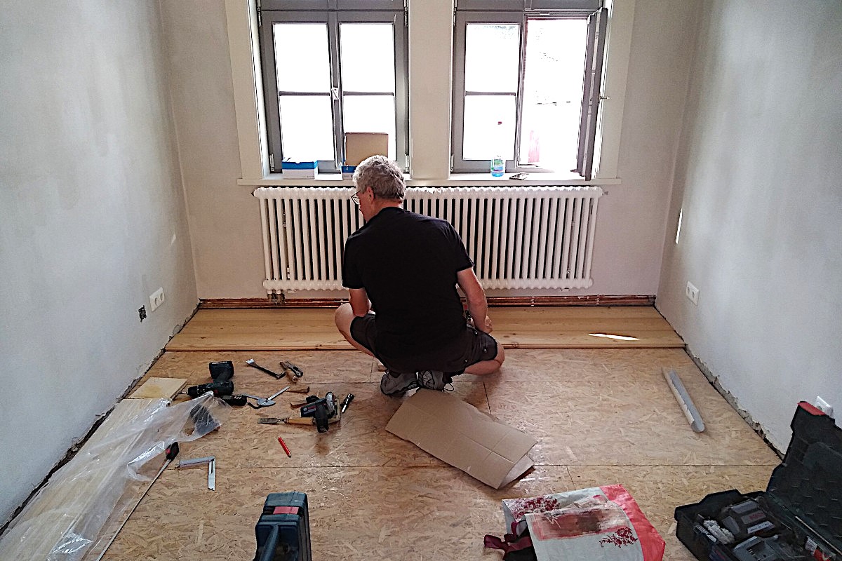 Aber auch fast alle Innentürblätter und die zugehörigen Bekleidungen konnten erhalten werden, ebenso wie die beiden Holztreppen zum Ober- und Dachgeschoss. Die Holzfußböden in Wohnzimmer und Flur Obergeschoss sind aufgearbeitet, übrige Holzböden mit Lärchendielen erneuert. Die Behandlung der Holzböden erfolgte mit Fußbodenhartöl, die von weniger strapazierten Oberflächen mit Lappenwachs. Für deckende Farbanstriche kamen wasserverdünnbare Acryllackfarben zur Anwendung. Das Gartenhaus hat Türen und Fenstern aus aufgearbeitetem Altmaterial erhalten.